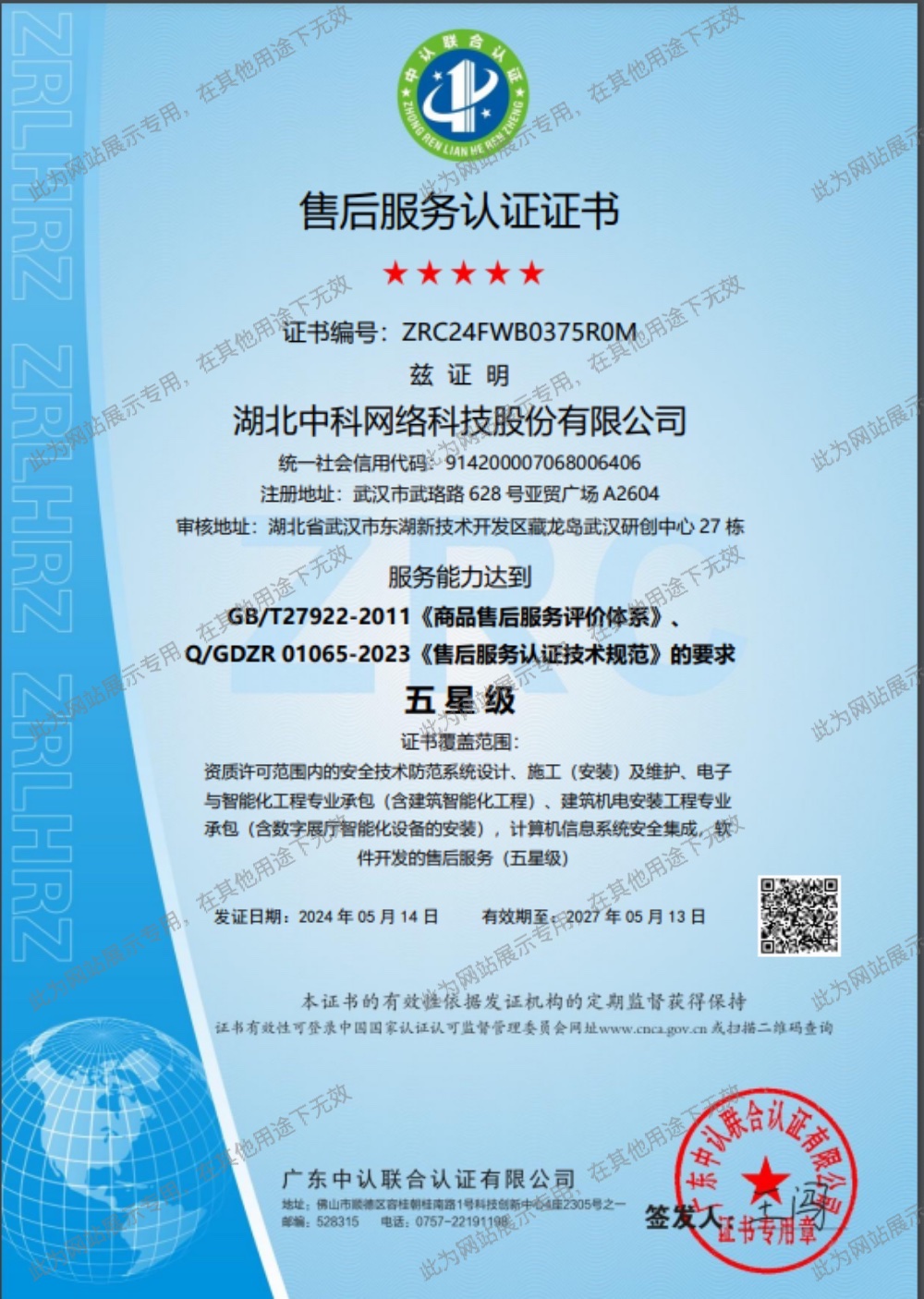 • 五星級售后服務(wù)認證證書